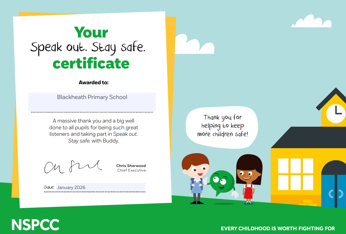 As part of our commitment to safeguarding and pupil wellbeing, Blackheath Primary School participates in the NSPCC’s Speak Out. Stay Safe programme. Pupils in Years 2, 5 and 6 take part in age-appropriate workshops and assemblies designed to help them understand the importance of staying safe, recognising unsafe situations, and knowing how to seek help.